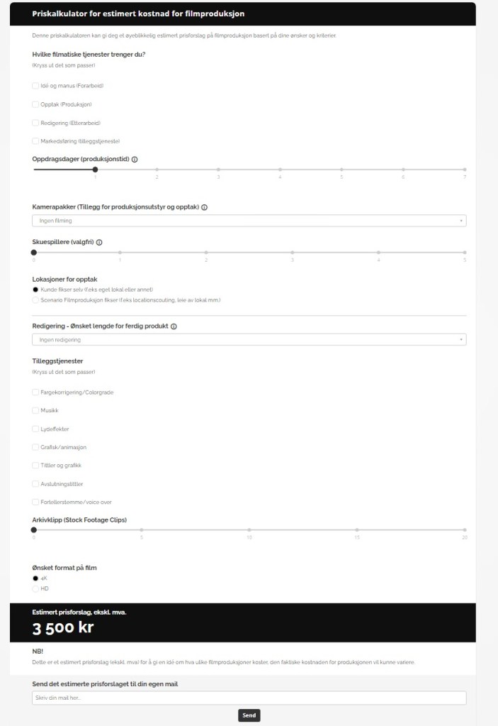 Har du en idé om hvilken type film du ønsker? Prøv vår priskalkulator for å få et realistisk prisestimat basert på dine ønsker og kriterier. Du kan velge enkelttjenester som redigering eller filming, eller en full filmpakke.